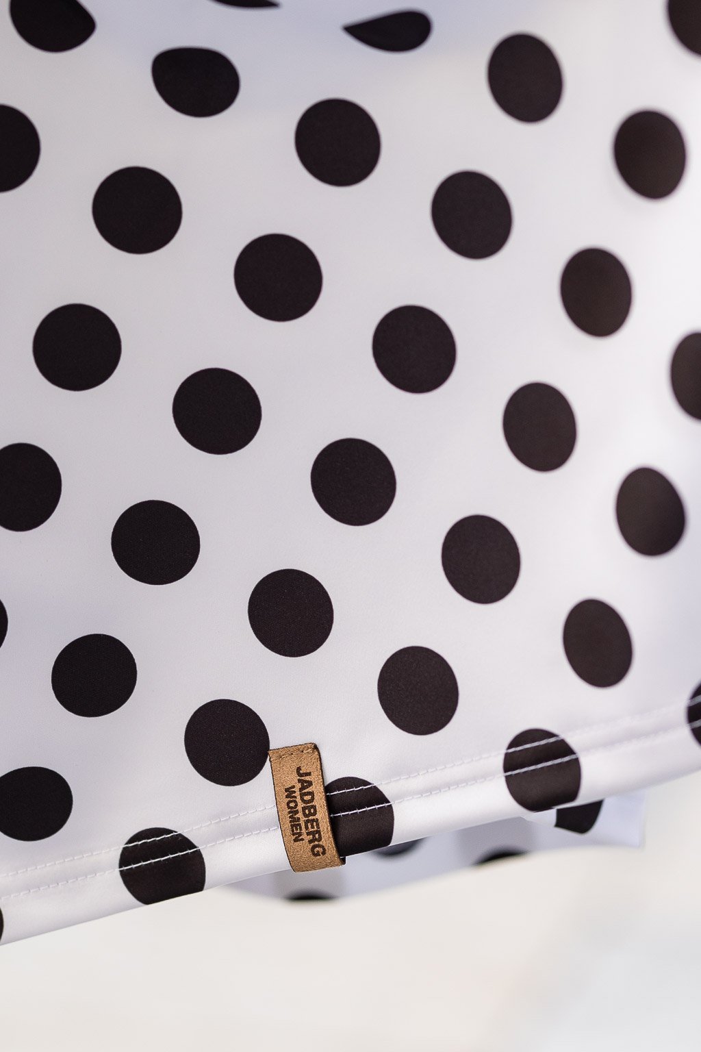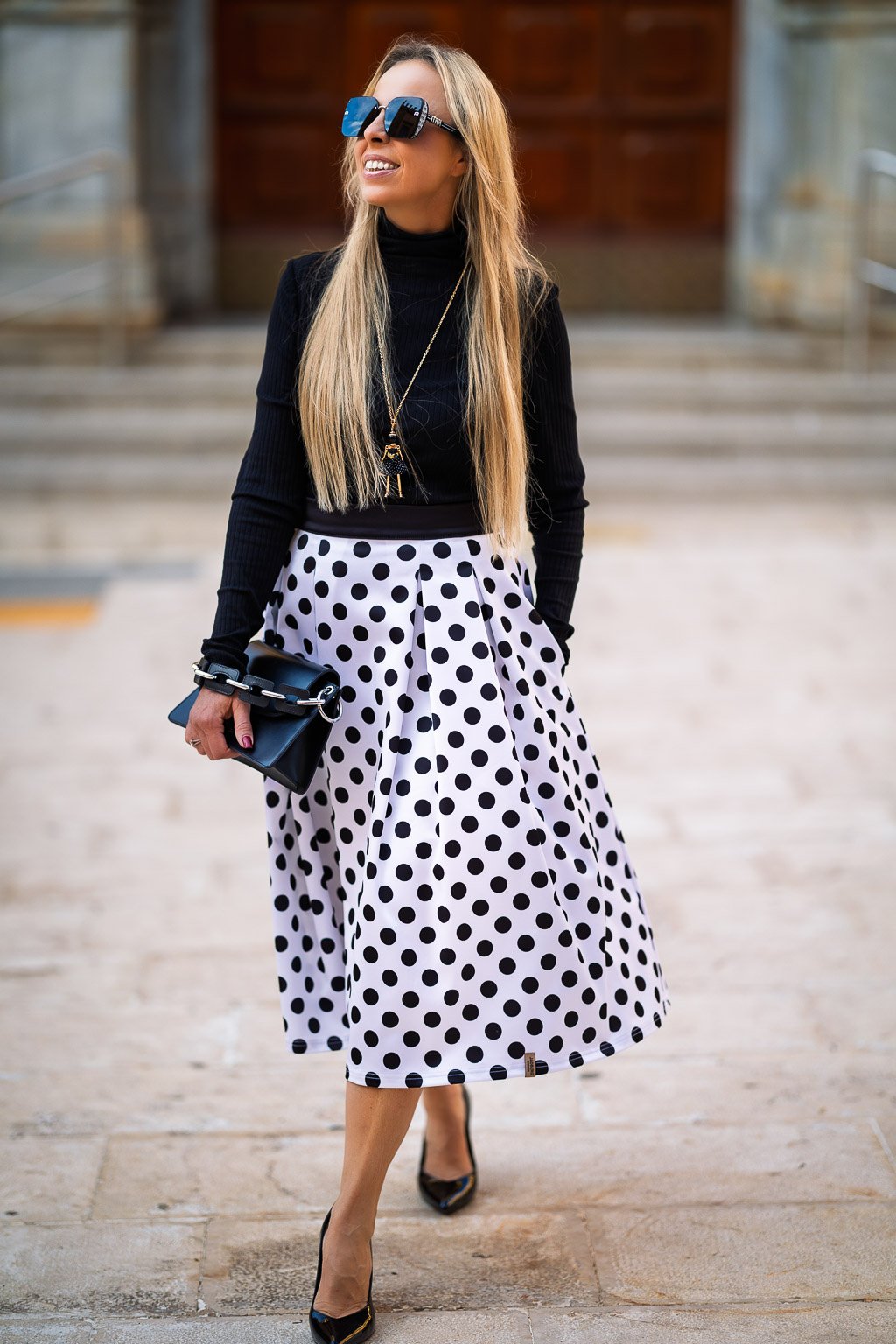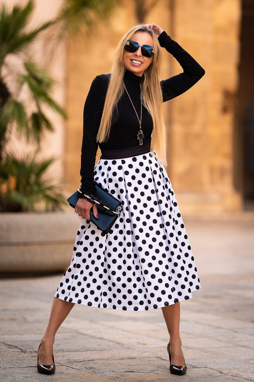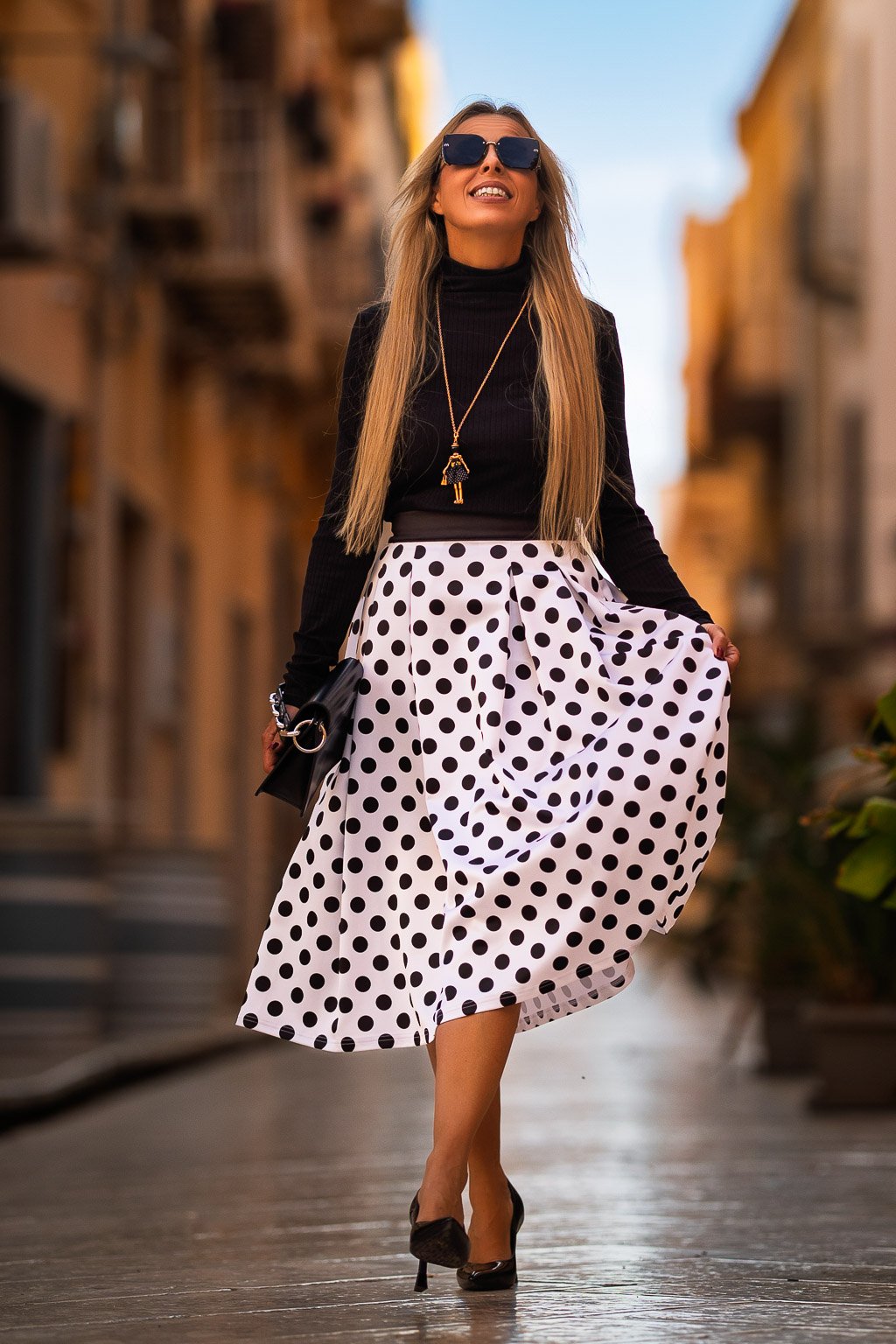 Saténová skládaná midi sukně Bibi v bílé s černými puntíky vytváří nádhernou siluetu a má praktické kapsy. Hladký přední pas, pružná guma vzadu a skrytý zip zajistí perfektní pohodlí i elegantní vzhled.