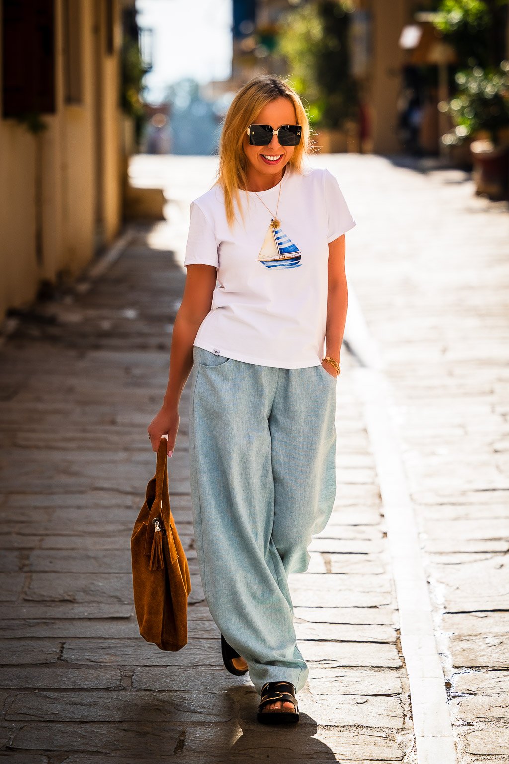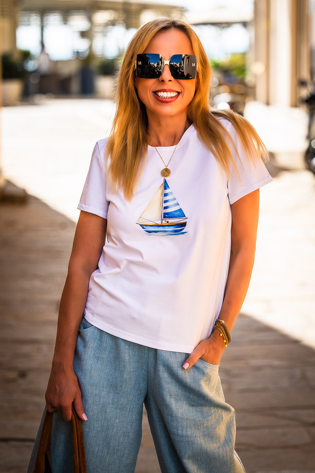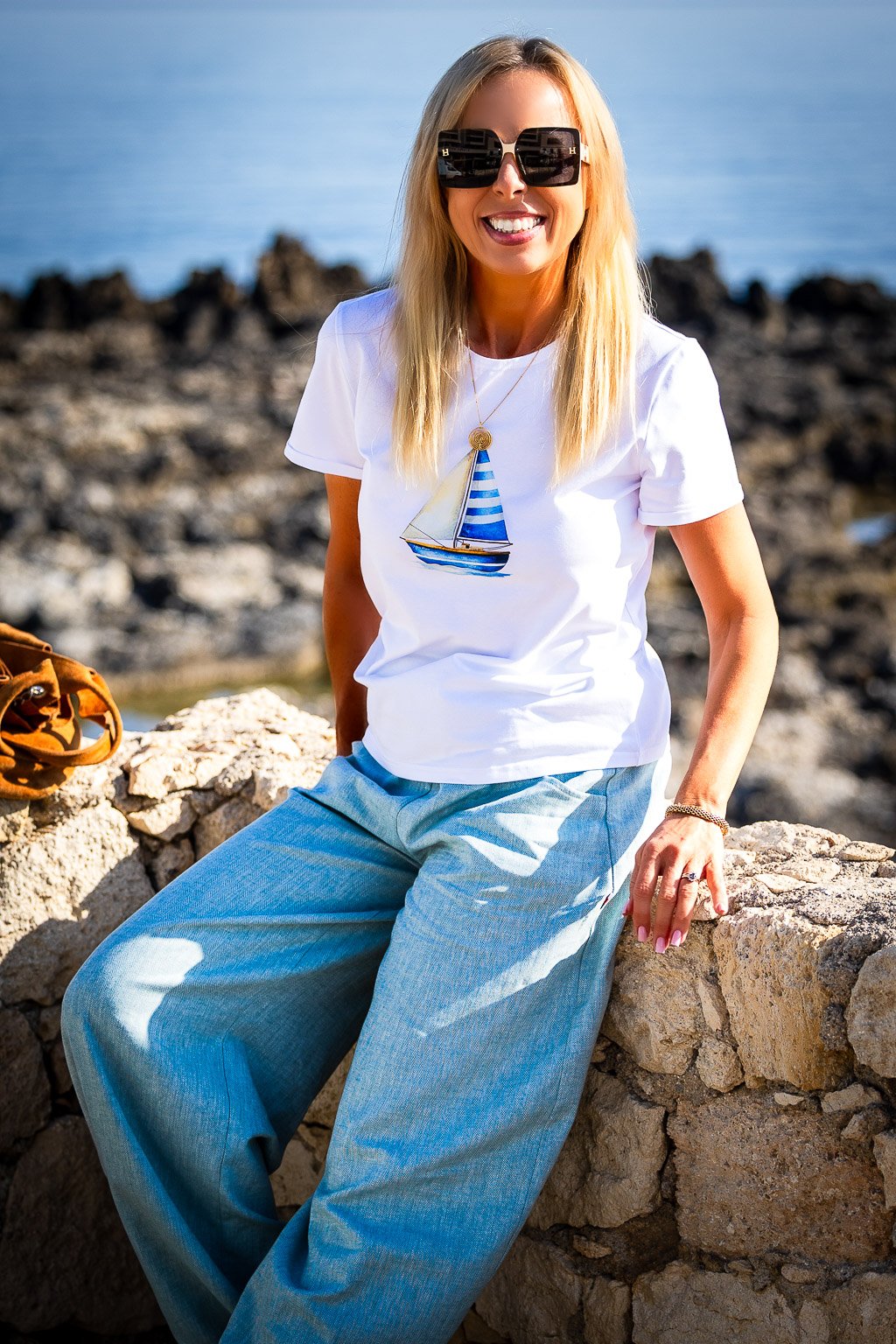 Bílé triko dámské Nautica má výstřih do oblouku, elegantní manžetky na rukávech a padnoucí střih, který jsem navrhla podle vlastní konstrukce. A ten potisk? Jemná plachetnice ve středomořském stylu – připomínka pomalých letních dnů a vůně moře. Fotili jsme ho v malebných uličkách Rethymna na Krétě, kde se skvěle doplňuje s našimi novými kalhotami Nikos. ⛵