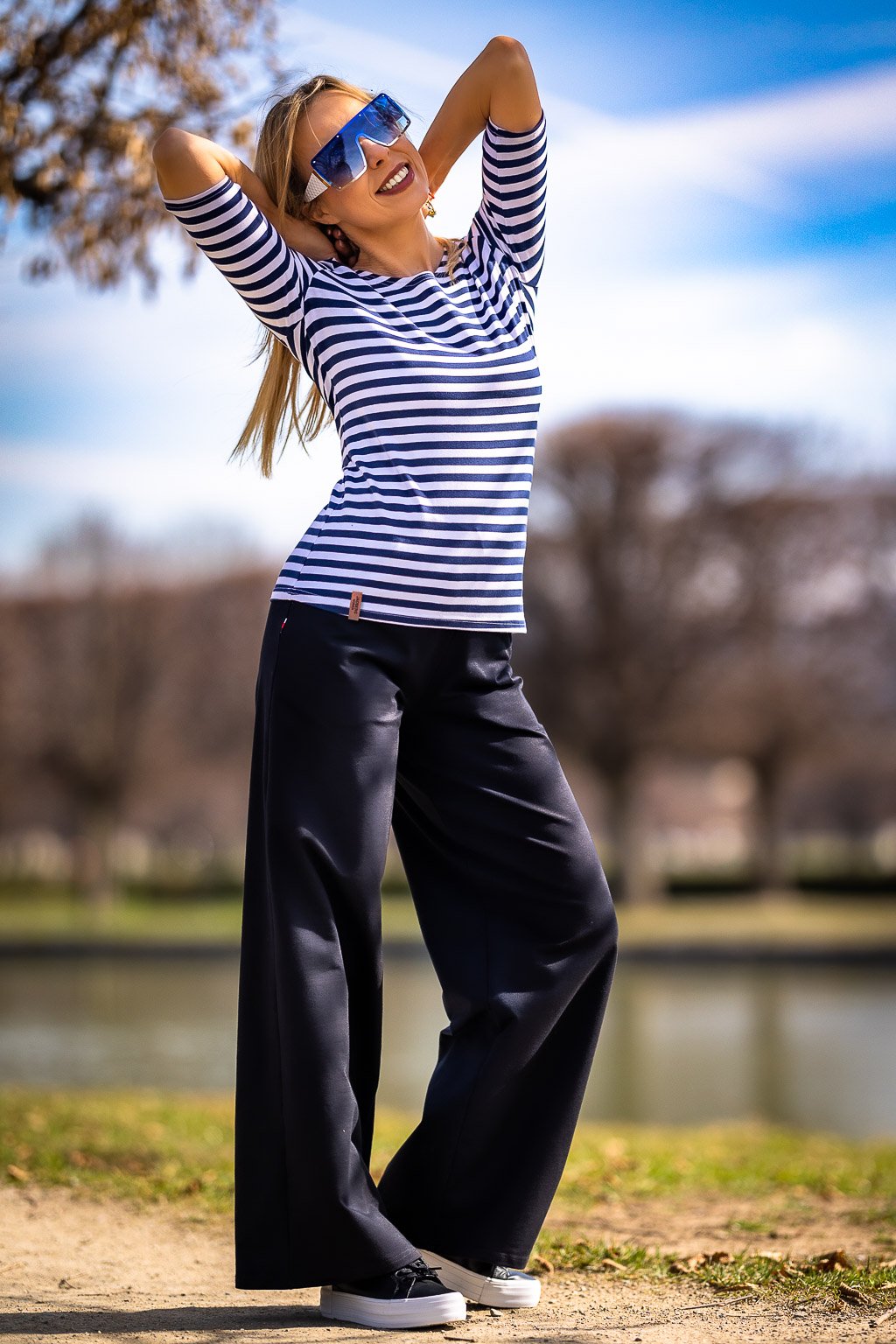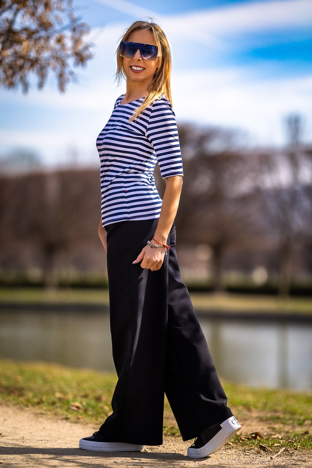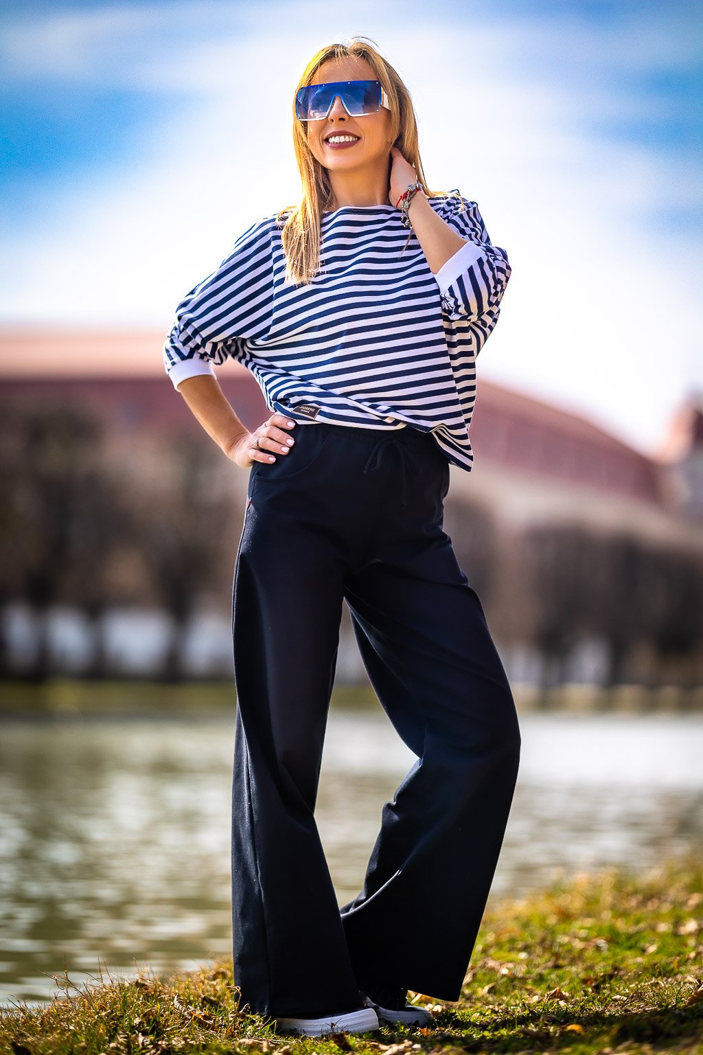 Široké dámské kalhoty vyrábíme v naší rodinné dílně na Moravě, takže máte jistotu, že podporujete lokální výrobu a zároveň si můžete být jisti kvalitou materiálů a zpracování. Modelka na obrázku měří 170 cm a má velikost S-M.