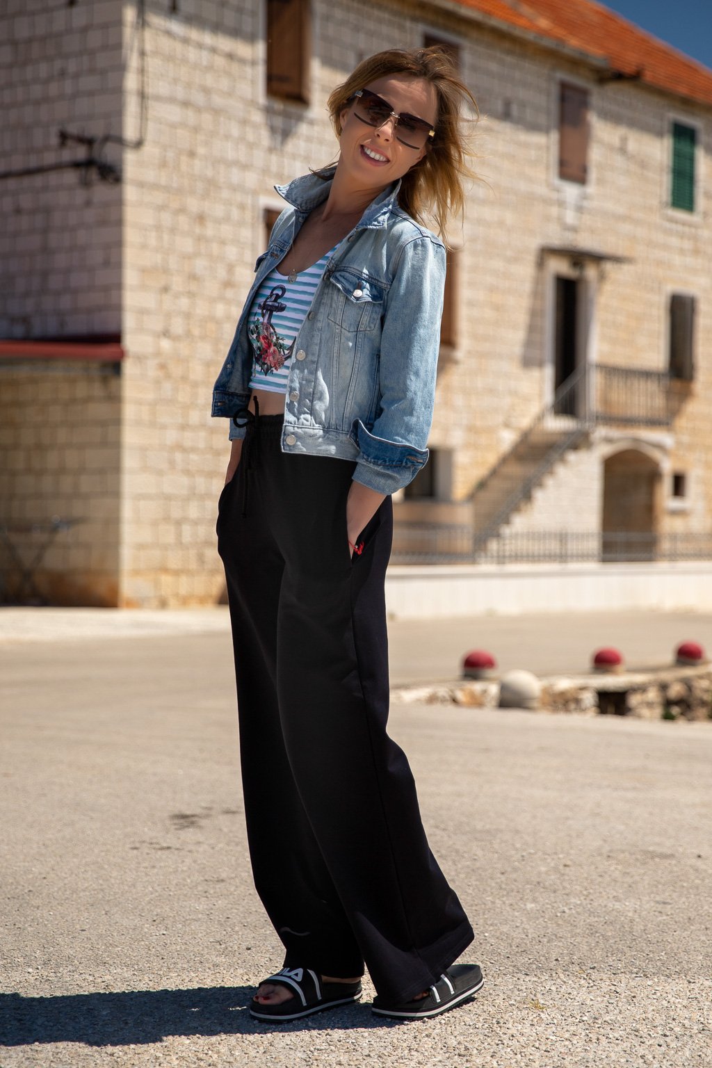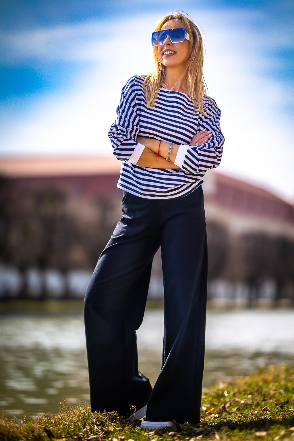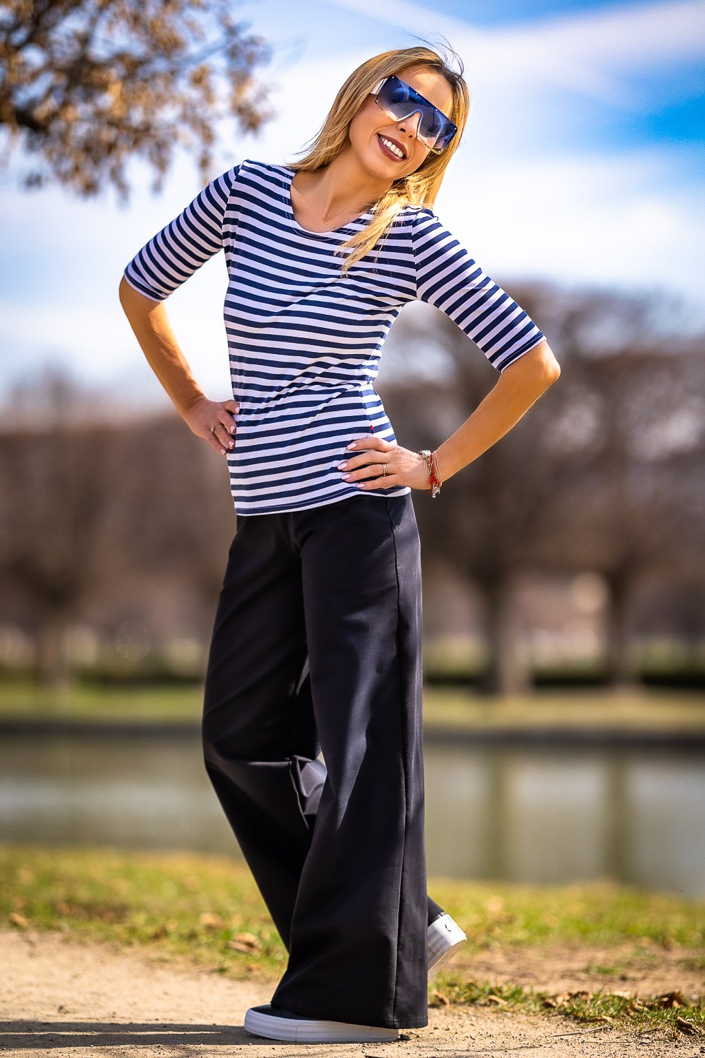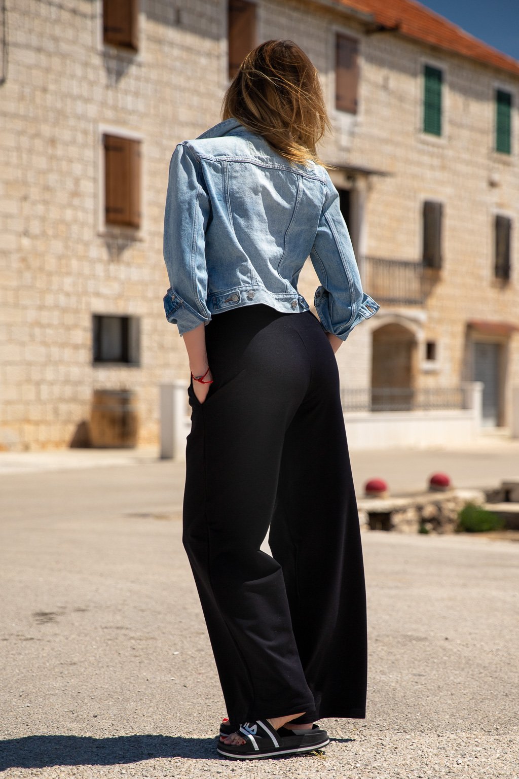 Široké dámské kalhoty vyrábíme v naší rodinné dílně na Moravě, takže máte jistotu, že podporujete lokální výrobu a zároveň si můžete být jisti kvalitou materiálů a zpracování. Modelka na obrázku měří 170 cm a má velikost S-M.