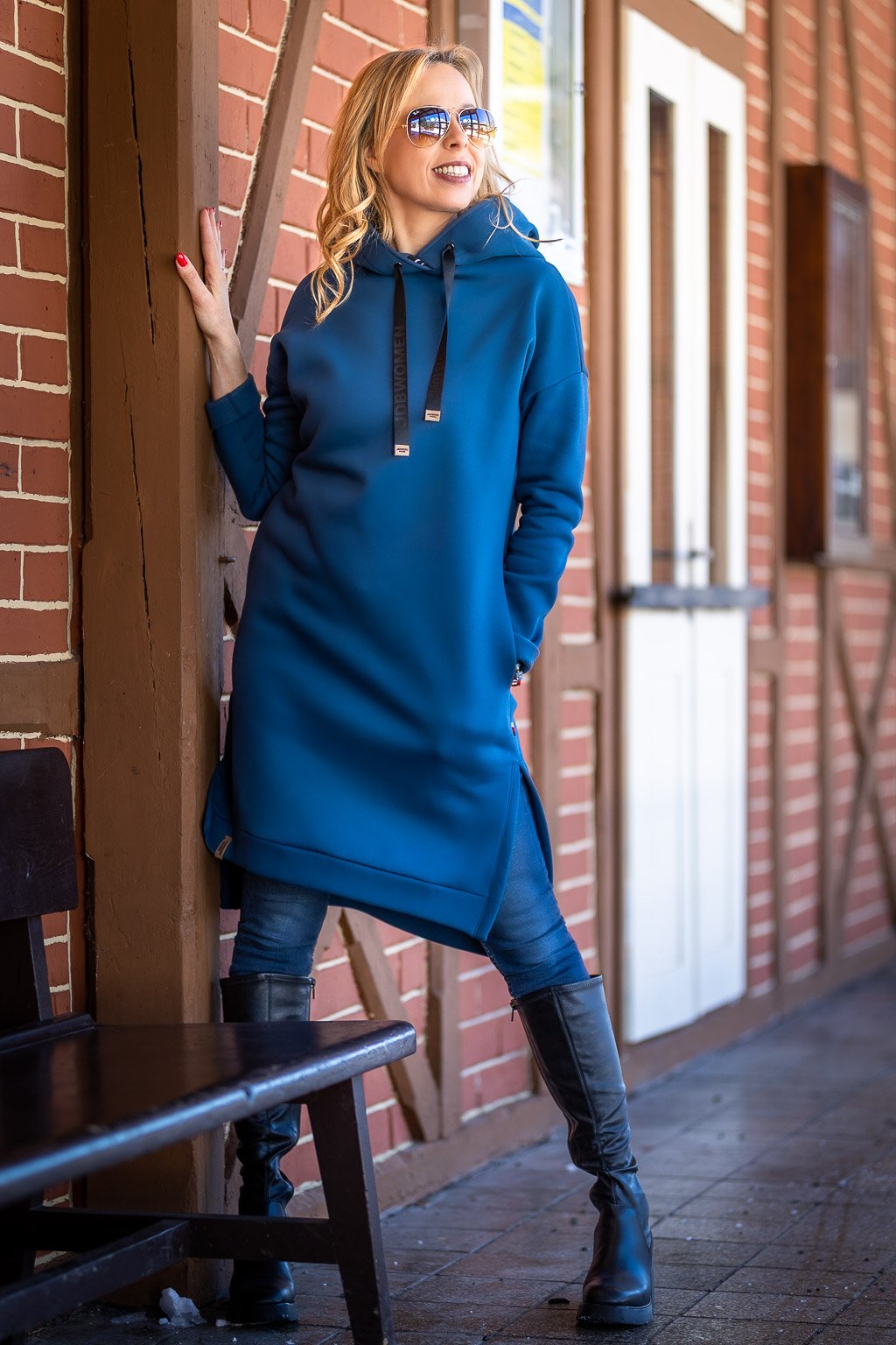 Atraktivní a moderní mikinošaty (dámská dlouhá mikina) Claire s kapucí a rozparky v krásné tmavě modré barvě, jsme navrhli a vyrobili z měkkého, bavlněného výplňku (z rubu počesaného). Mikinošaty Claire jsou opravdová stylovka a určitě je budete ráda nosit. Jsou volnějšího, lehce vypasovaného a pohodlného střihu s prodlouženou délkou. Snadno se kombinují například s legínami nebo džínami a výborné jsou do práce, na nákupy nebo do města.