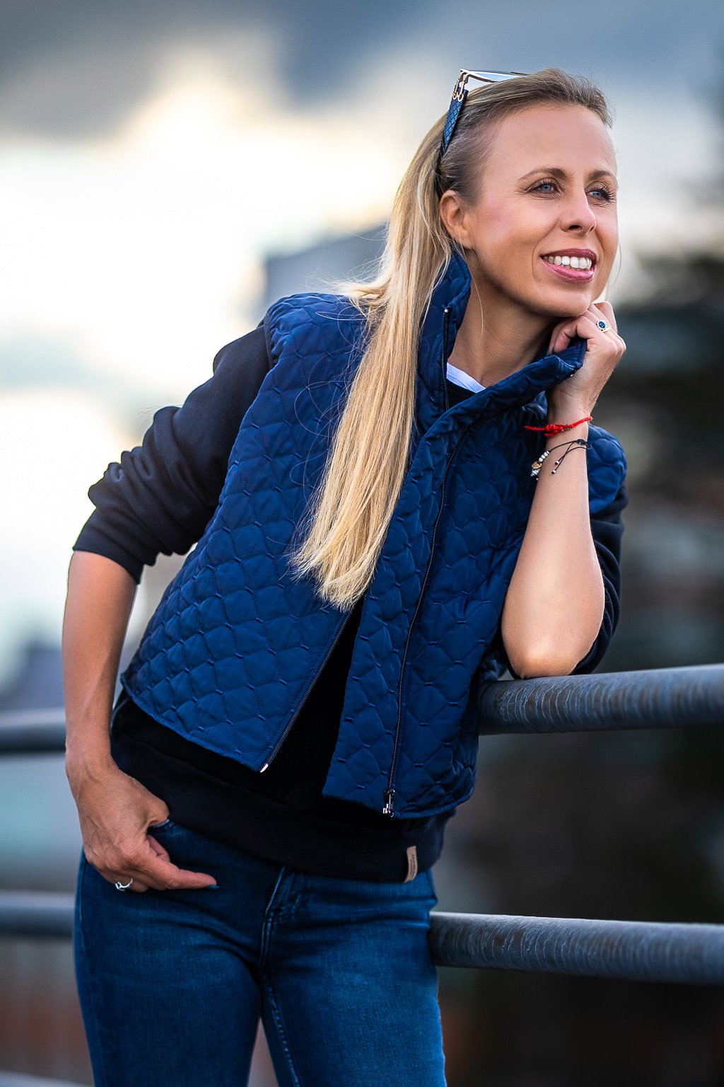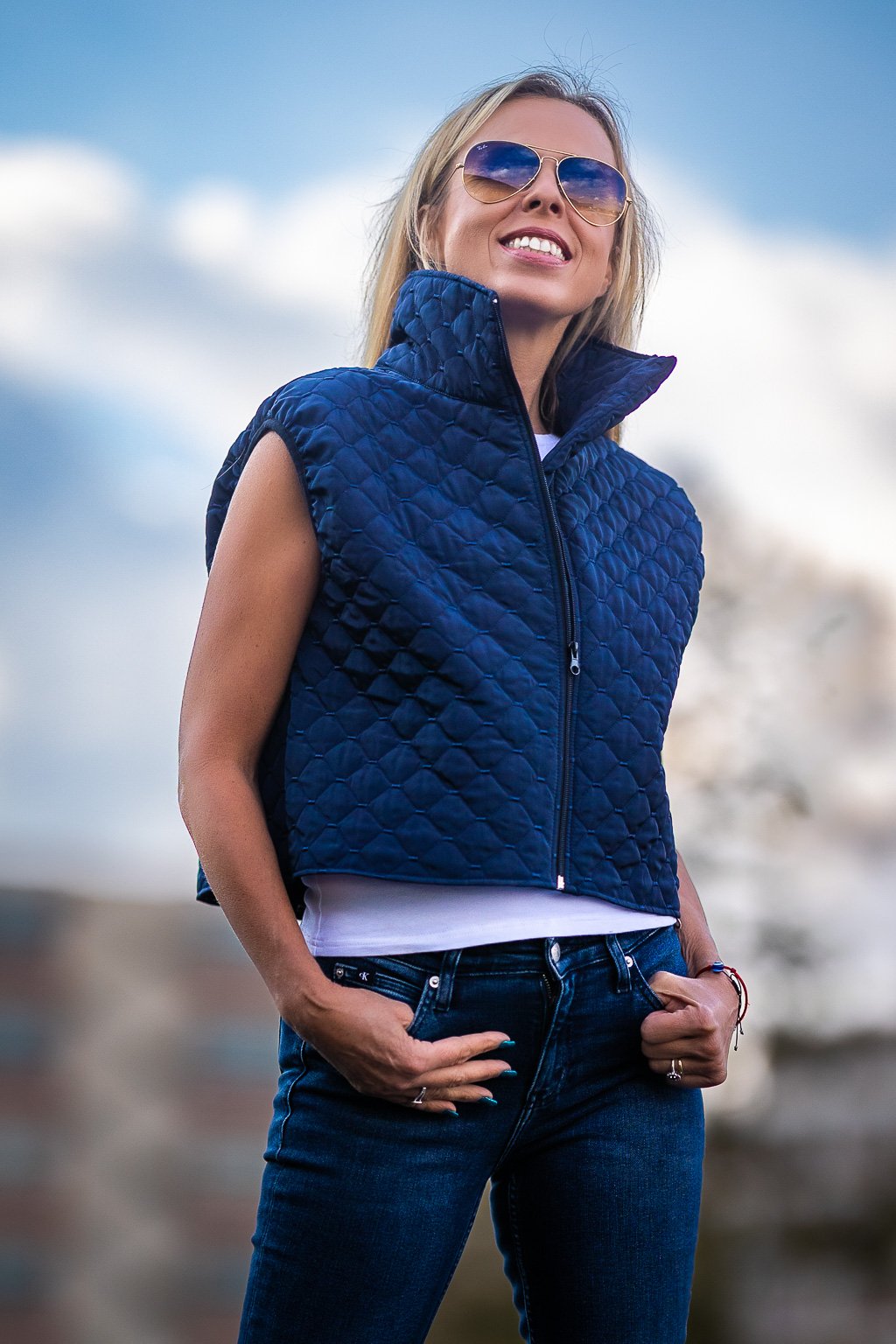Letošní stylovka-krátká prošívaná dámská vesta se zipem a klopou s průramky staženými gumou. Vestička zahřeje a dokonale doplní outfit.