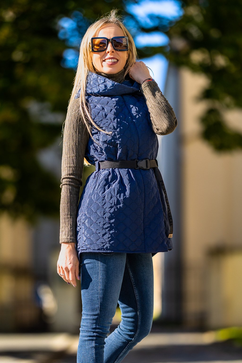 Novinka-středně dlouhá originální dámská prošívaná vesta ASPEN s páskem a kapucí v trendové tmavě modré barvě a super šik délce. Vestička Vás zahřeje a suprově doplní outfit. Je to kousek, který by neměl chybět ve Vašem šatníku. Krásný, prošívaný a zateplený materiál hraje na sluníčku různými odstíny modré a vesta se stane korunou Vašeho nového outfitu, protože v reálu vypadá opravdu luxusně.