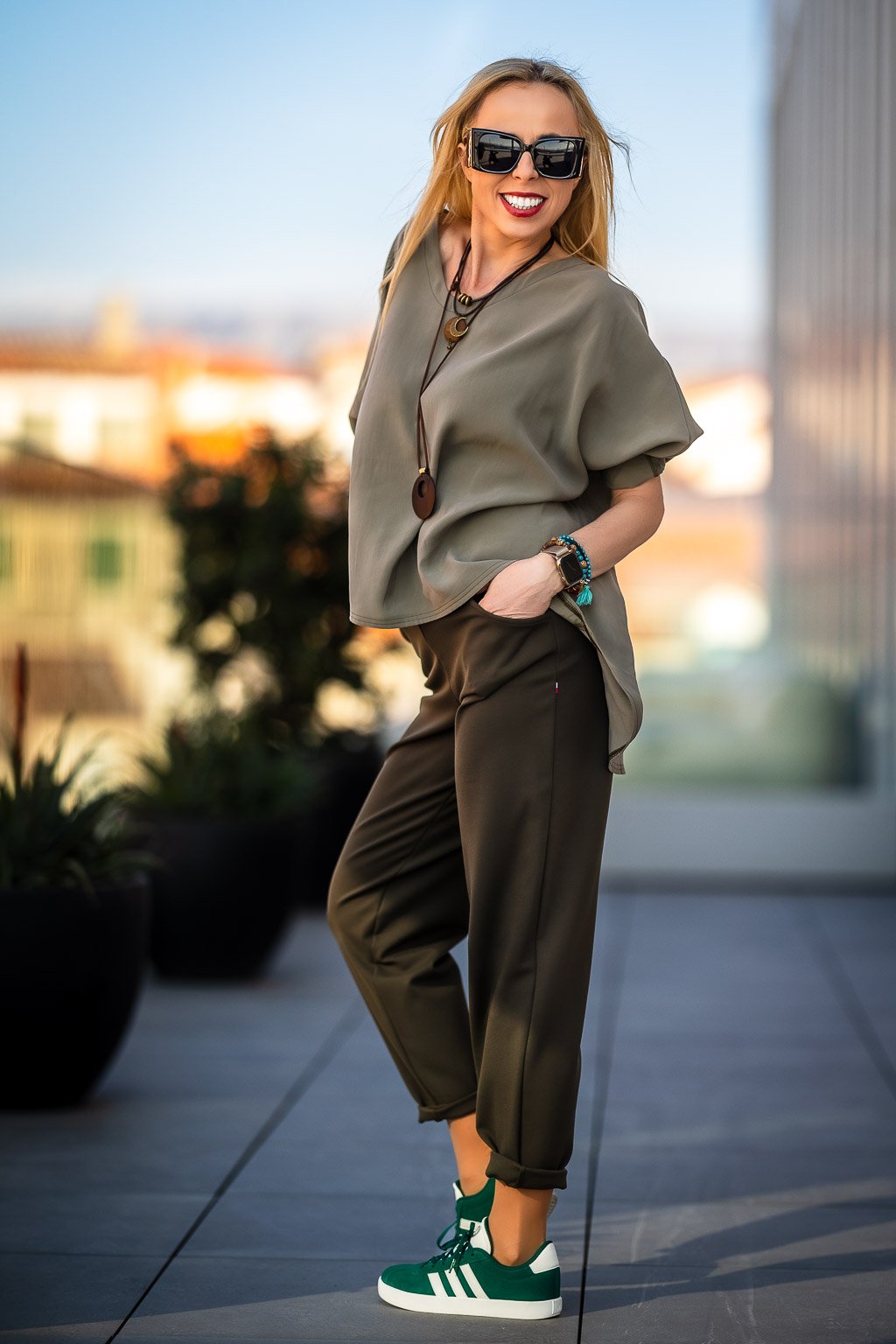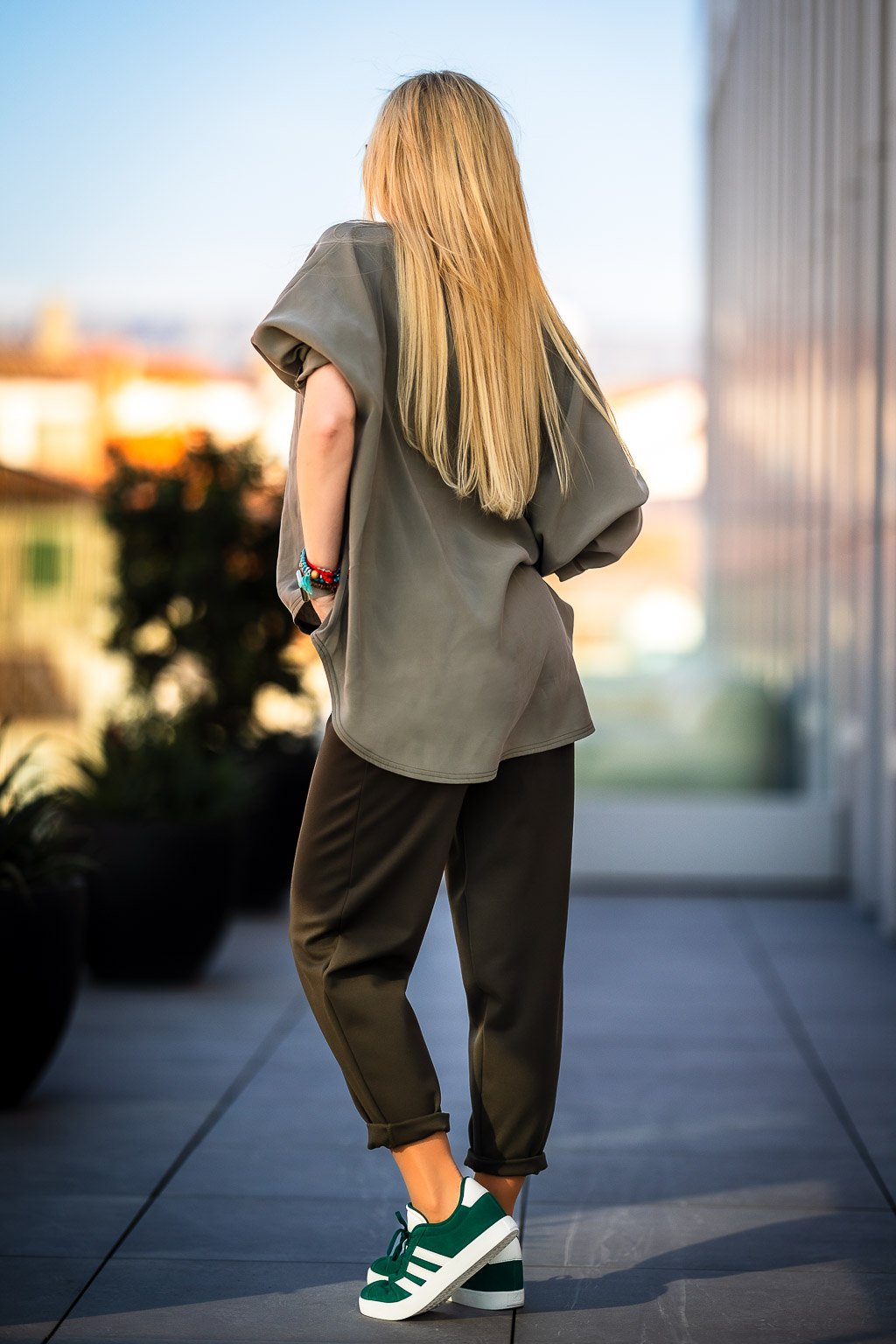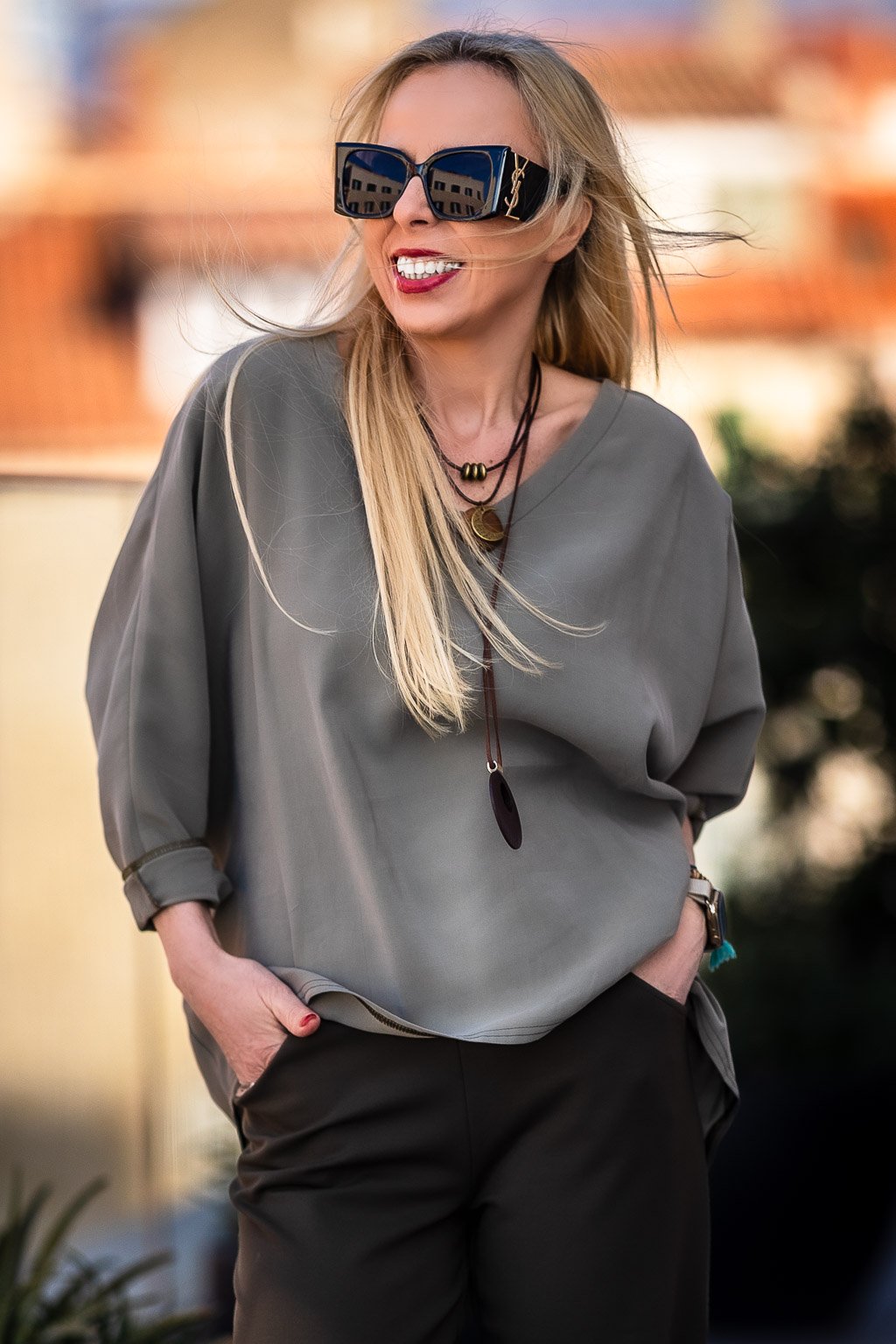 Naše dámská halenka Darcy vás okouzlí nejen materiálem, ale i trendy khaki barvou, která je právě na vrcholu módních trendů. Přizpůsobivý a pohodlný oversize střih společně s netopýřími rukávy nabízí originalitu a styl, zatímco možnost ohrnutí rukávů přidává na praktičnosti a variabilitě v nošení.