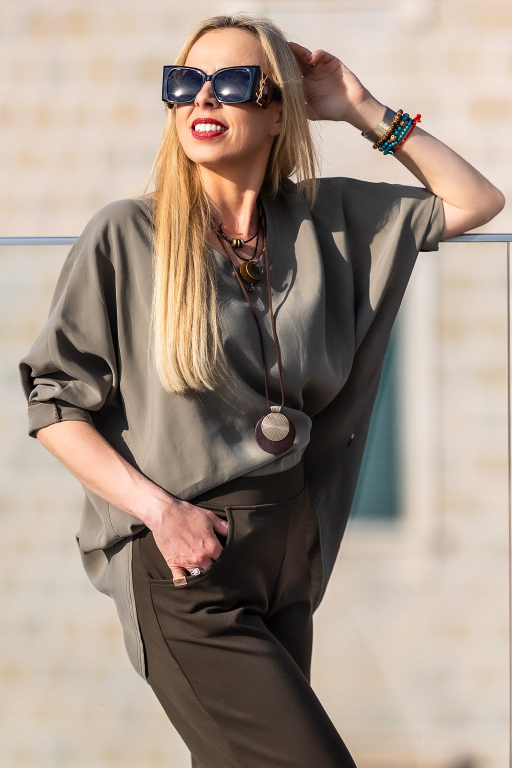 Přivítejte jedinečnost a styl s naší novou halenkou Darcy. Trendová khaki barva, 100% Modal, netopýří rukávy.