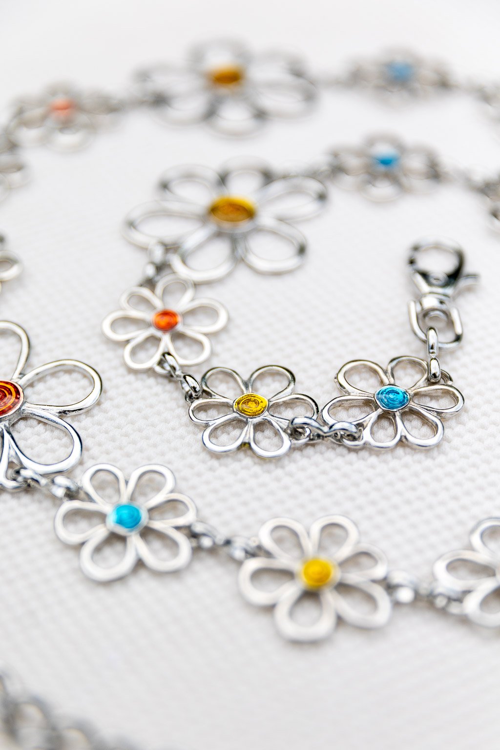 Chceš dodat svým šatům nebo sukni něco navíc? Řetízkový pásek Barevné kytky je přesně ten kousek, který Tě odliší. Elegantní kovová slitina s lesklým povrchem vytváří základ pro jemné květinové motivy s barevnými středy z pravého smaltu – působí hravě, ale přitom sofistikovaně.