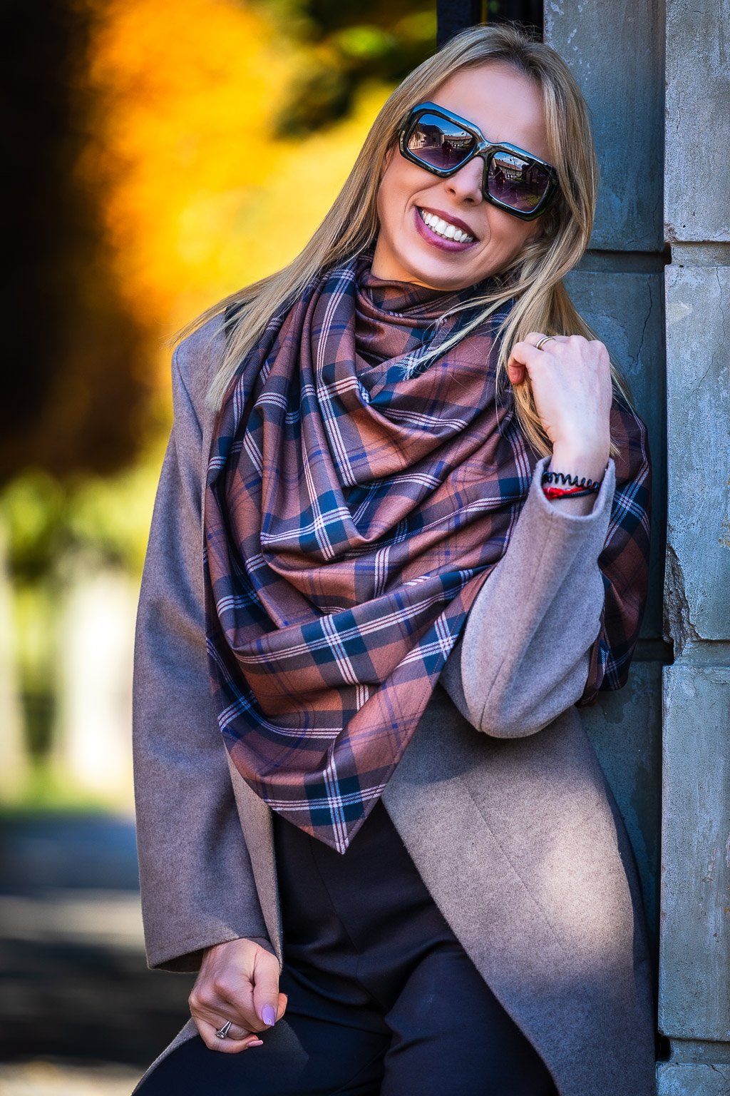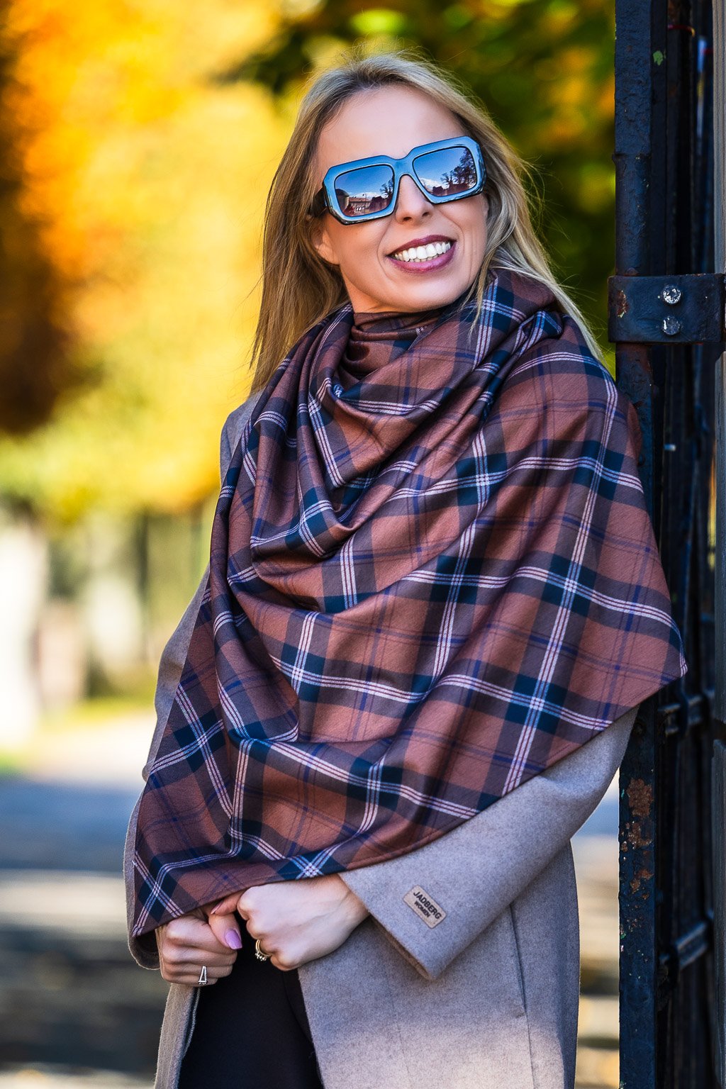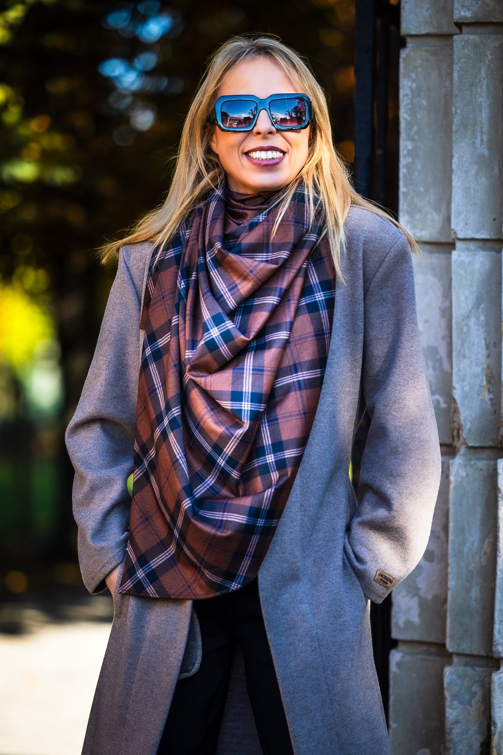 Oživte svůj šatník elegantním dámským šátkem na krk, který je synonymem luxusu a pohodlí. Vyrobený s láskou v naší lokální dílně na Moravě. Tento dámský šátek je výborný na krk, ale dá se použít i na hlavu, když Vás nenadále zastihne změna počasí. Krásný tartanový vzor v hnědých tónech dodává šátku klasický, ale zároveň trendový vzhled. Elegantní šátek Skye není jen skvělým doplňkem, ale i teplým společníkem pro chladnější dny. Šátek na krk Skye se skvěle hodí do kombinace s ostatními kousky nejen z naší kolekce a je hřejivý a slušivý zároveň. Dámský šátek je navíc oboustranný, dá se nosit i hnědou stranou nahoru. Při Sluníčku šátek hraje barvami a odráží krásné a uklidňující zemité tóny.