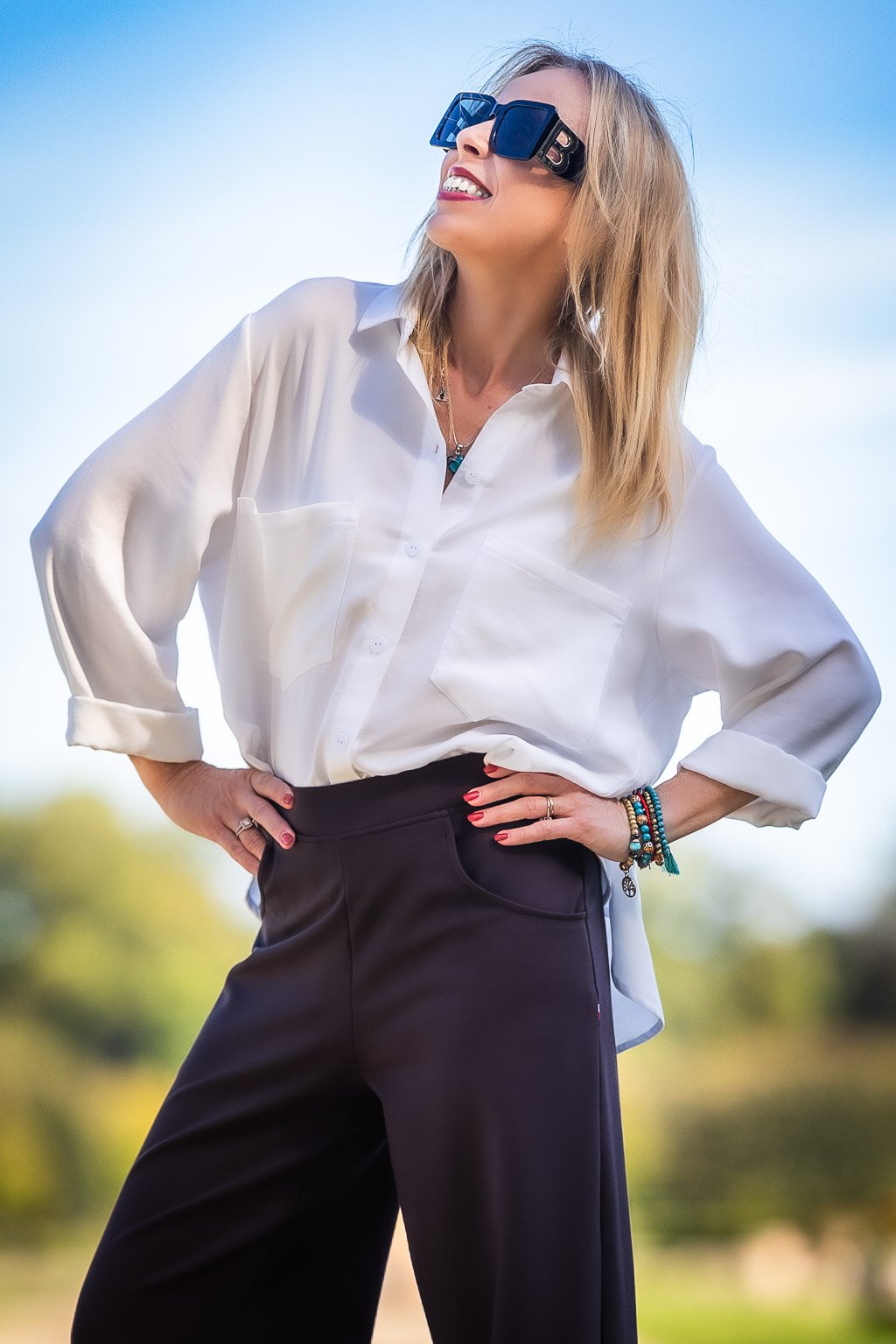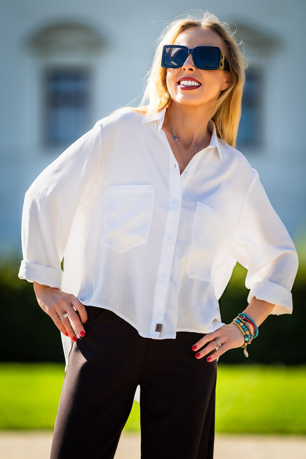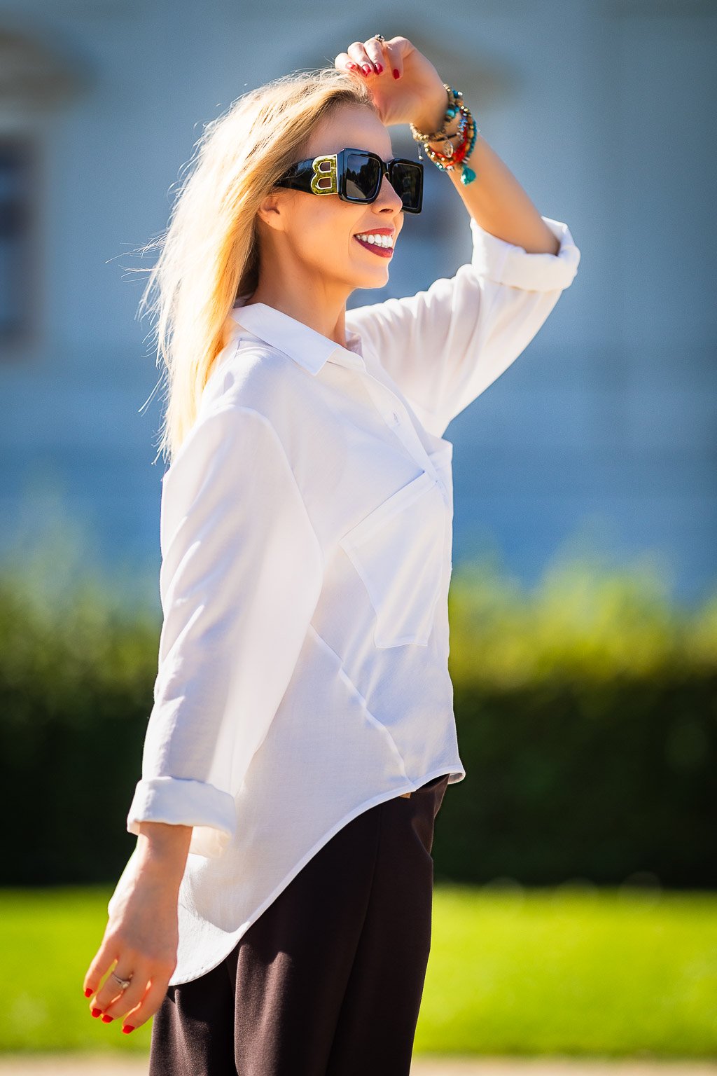 Jakýkoliv outfit s bílou košilí bude okamžitě působí elegantněji. Můžete ji kombinovat s kalhotami a sáčkem a vyrazit do práce. Vepředu ji zastrčte do džínů, nazujte tenisky a můžete se pustit do plnění víkendových úkolů. Zavažte ji, ohrňte rukávy – ať už upřednostňujete jakýkoliv styl nošení nebo v jakoukoliv roční dobu, s bílou košilí prostě nemůžete šlápnout vedle. Pokud půjdeme ještě hlouběji, dle dávných východních teorií bílá barva košile spolu s černými kalhotami nebo sukní vytváří barevnou kombinaci, která podporuje okruh ledvin a tím nám dodává odvahu, samostatnost a sebejistotu.