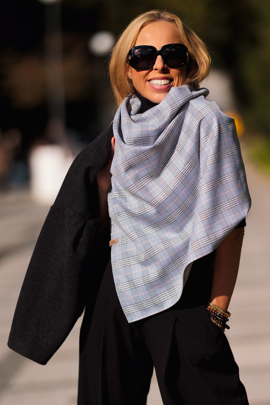 Nová šála Robin: Šedo-modrý tartan, jemné provedení a nekonečně možností stylingu – od Luhačovic až po Tvé každodenní cesty.