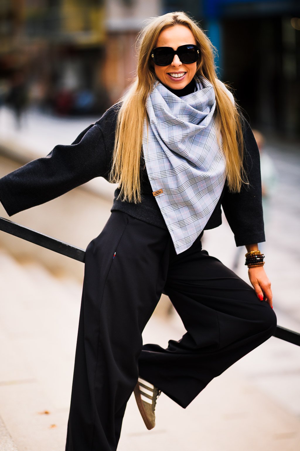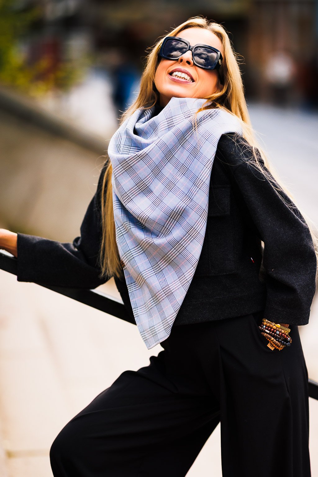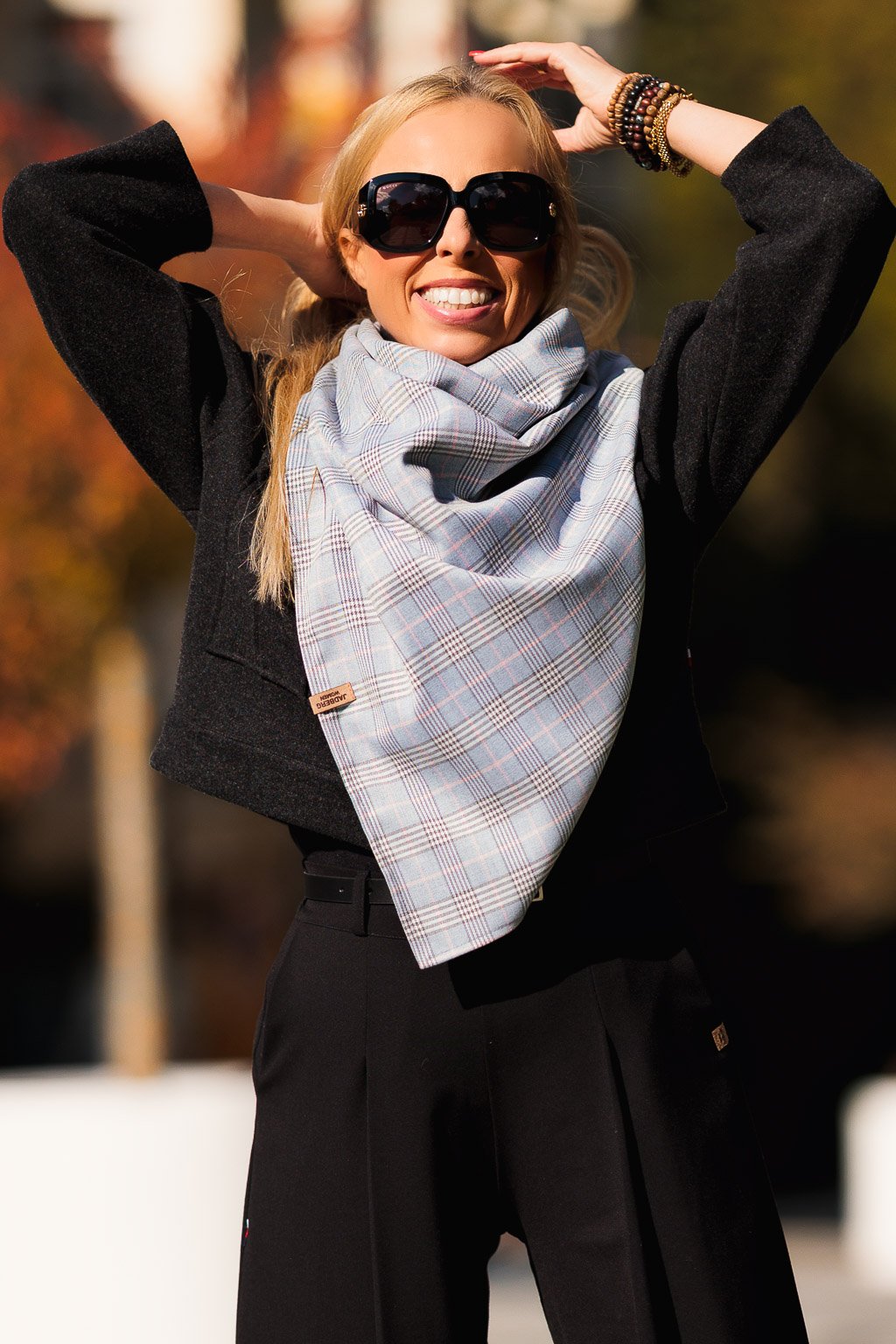 Nová šála Robin: Šedo-modrý tartan, jemné provedení a nekonečně možností stylingu – od Luhačovic až po Tvé každodenní cesty.
