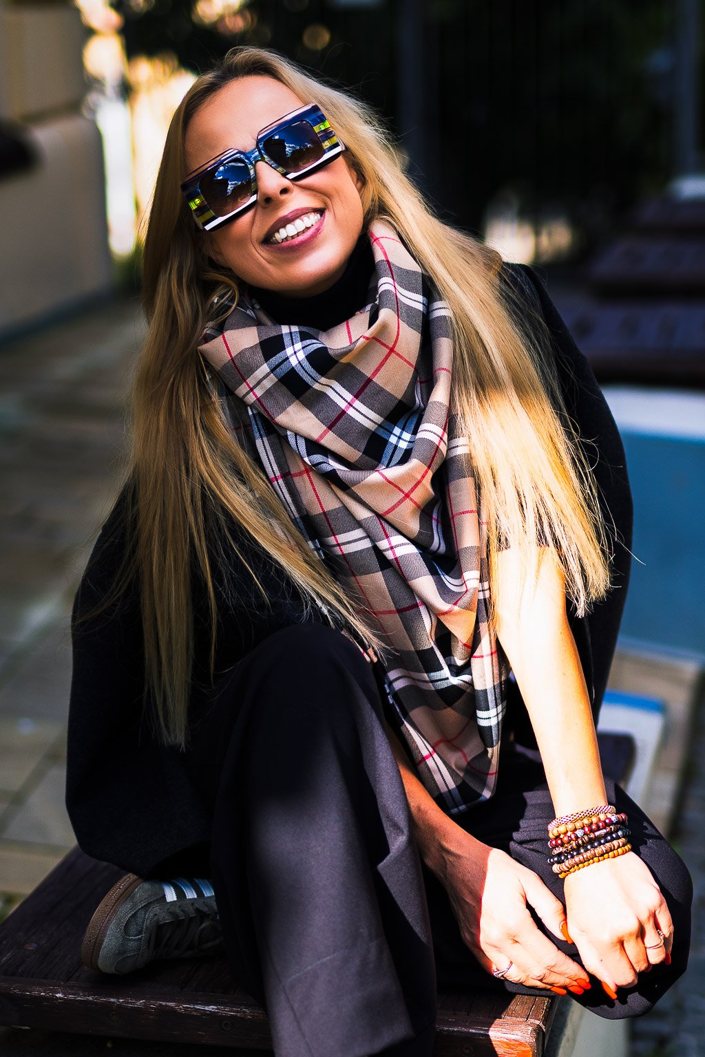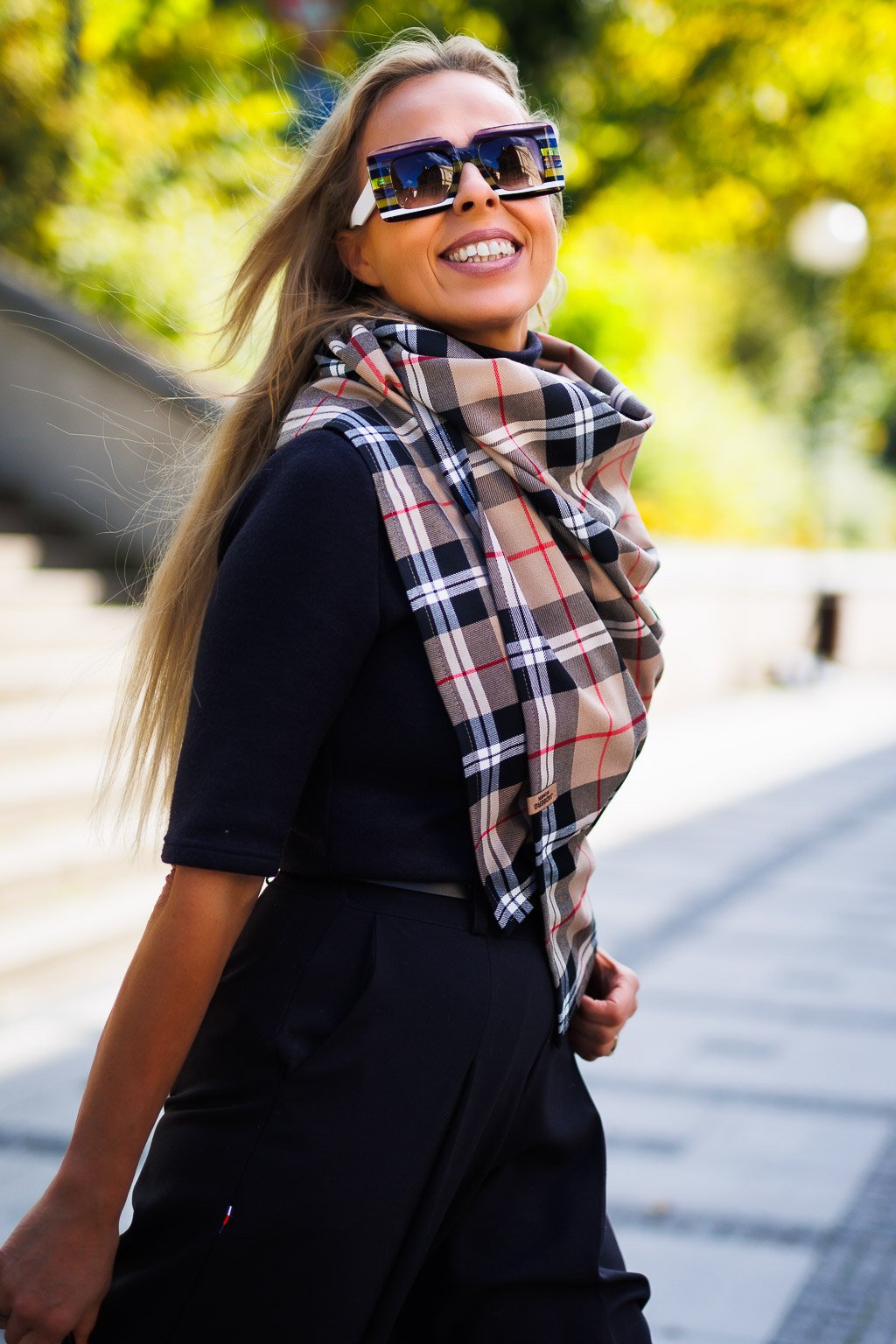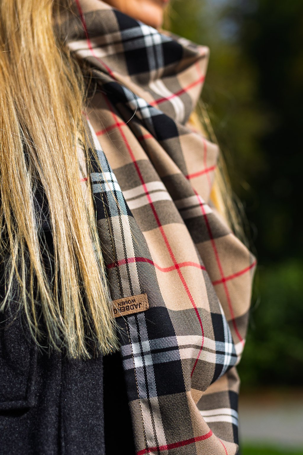 Seznam se s Kenzi – naší novou dámskou šálou v teplém béžovém tartanu s černými a jemně červenými linkami. Šijeme ji lokálně u nás na Moravě a je to znát: je pohodlná, drží tvar a vypadá luxusně bez zbytečné okázalosti.